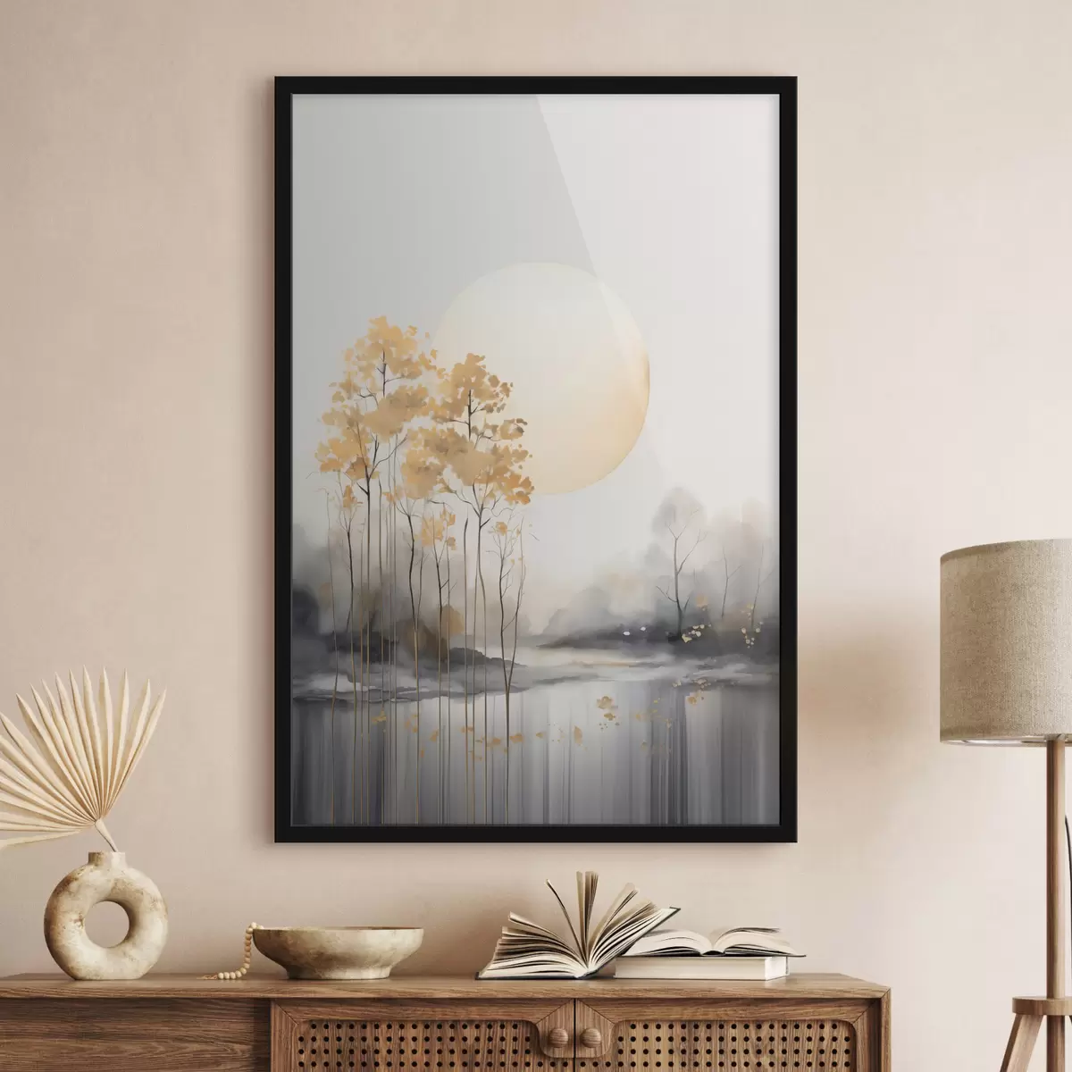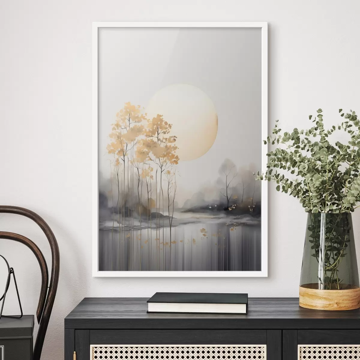 Affiche Paysage abstrait décoratif, grands arbres aux feuilles jaunes, une rivière et du brouillard en arrière-plan. Non f47014