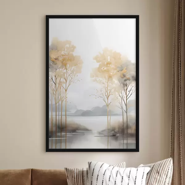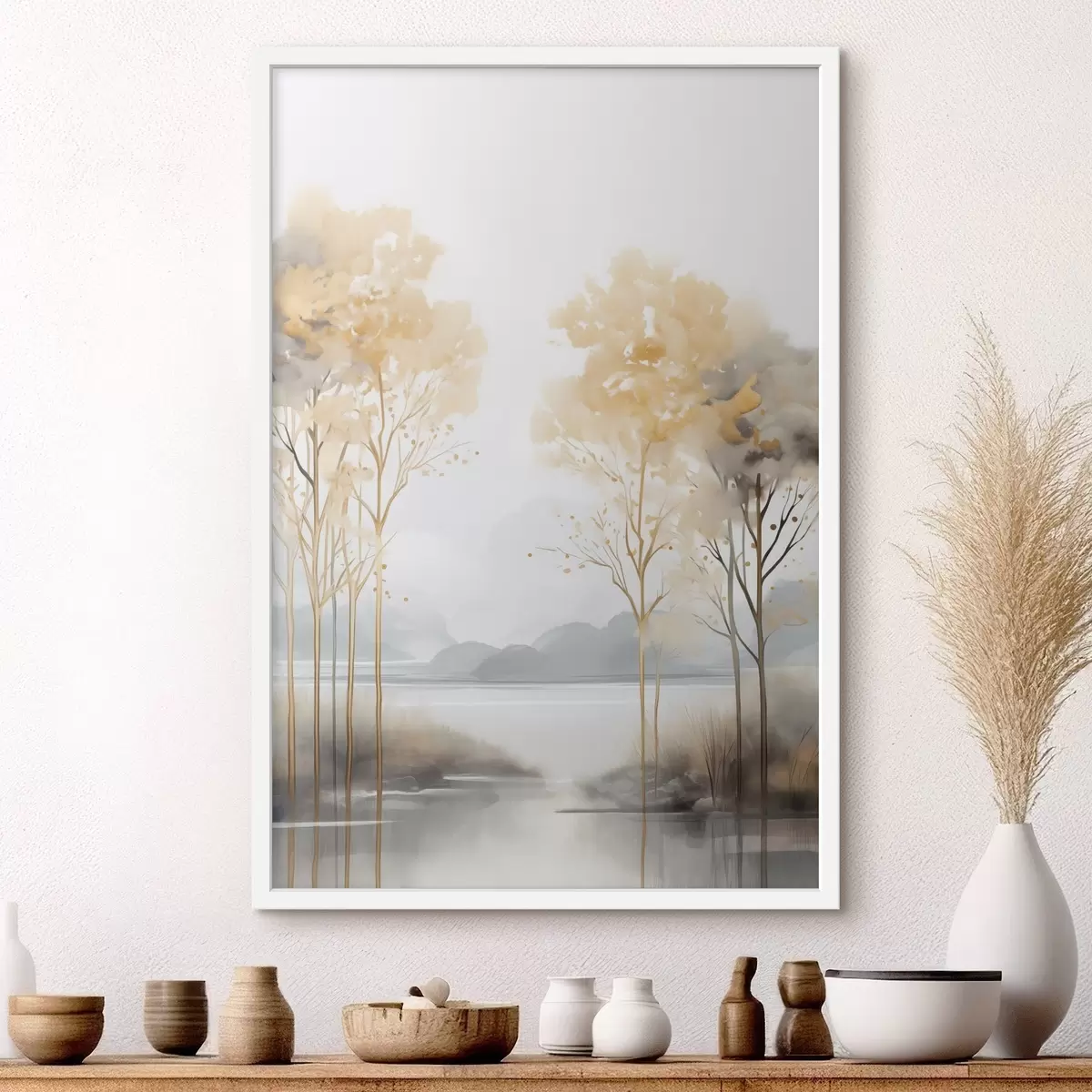 Affiche Paysage abstrait décoratif, grands arbres aux feuilles jaunes, une rivière et du brouillard en arrière-plan. Non f47015