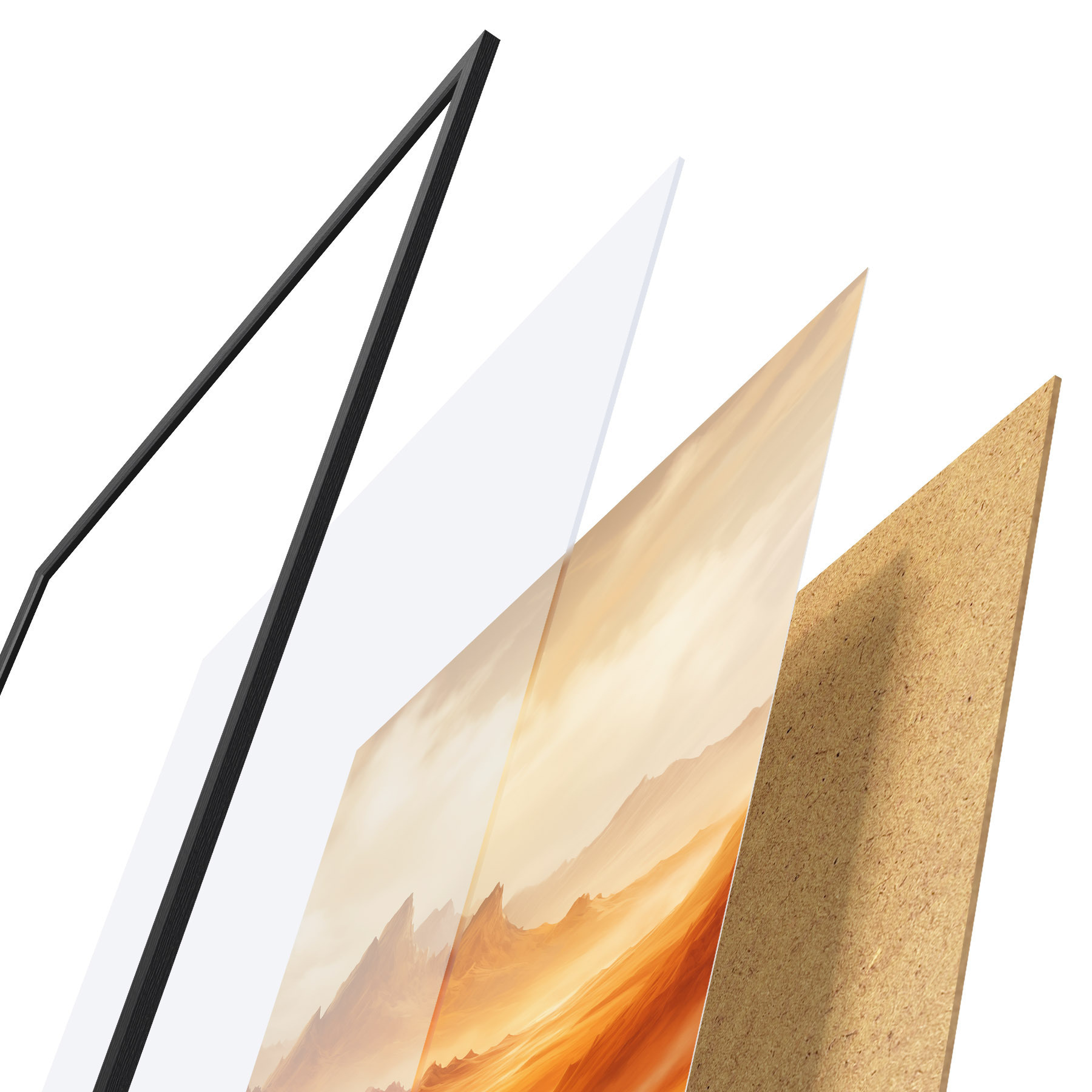 Le poster se compose d'un cadre, d'un plexiglas, d'une image imprimée et d'un support en aggloméré. Le poster peut être immédiatement accroché au mur grâce aux fixations au dos.