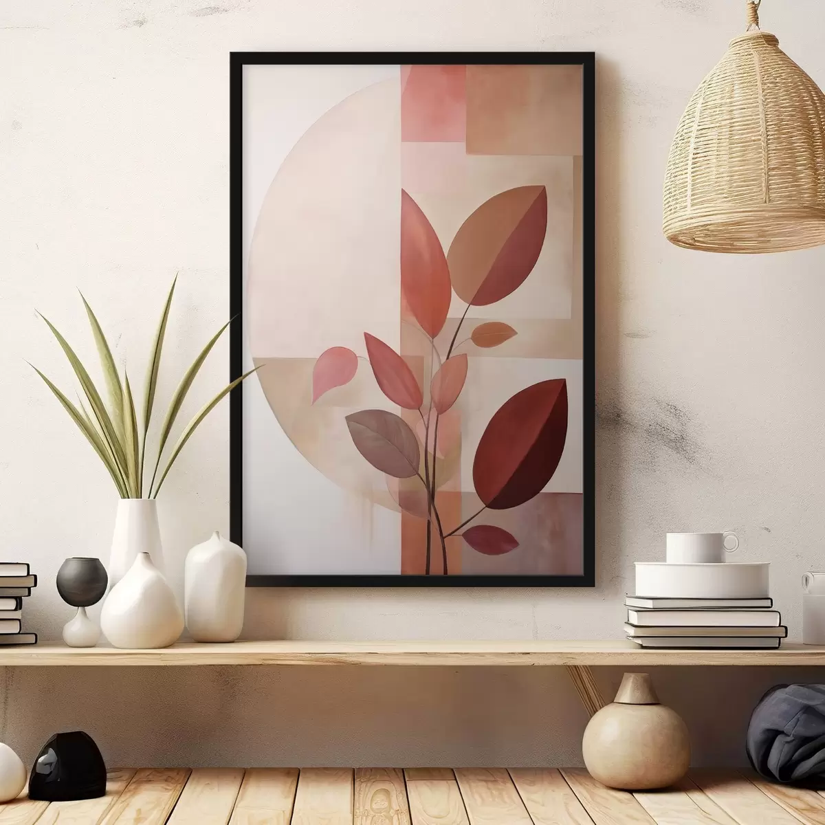 Affiche Plante abstraite aux feuilles rouges sur fond de formes géométriques et de couleurs douces et discrètes Non f47041