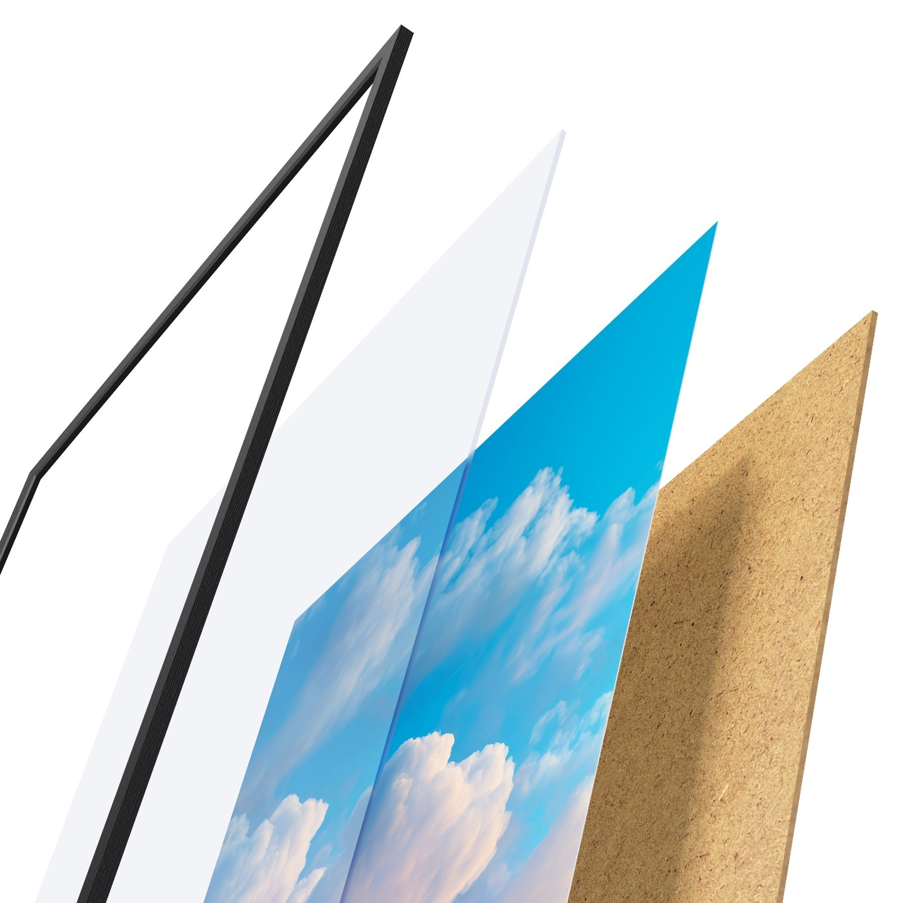 Le poster se compose d'un cadre, d'un plexiglas, d'une image imprimée et d'un support en aggloméré. Le poster peut être immédiatement accroché au mur grâce aux fixations au dos.