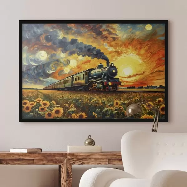 Affiche Train à vapeur dans un champ avec un ciel spectaculaire f47257