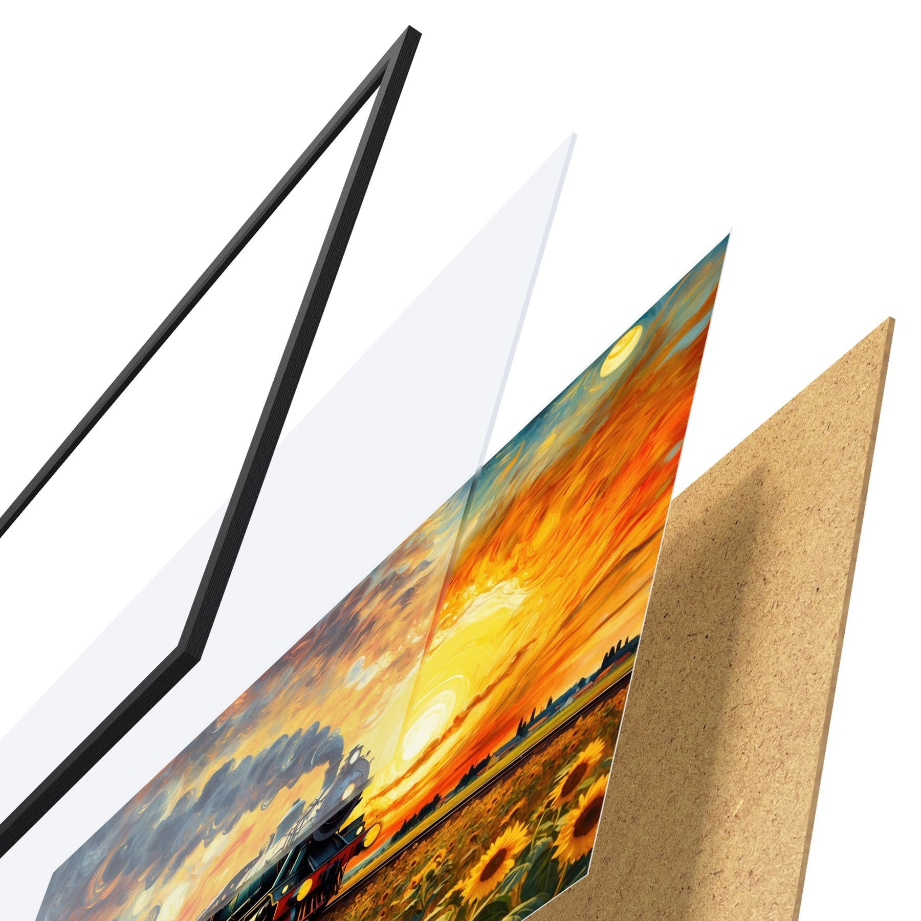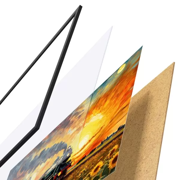 Le poster se compose d'un cadre, d'un plexiglas, d'une image imprimée et d'un support en aggloméré. Le poster peut être immédiatement accroché au mur grâce aux fixations au dos.