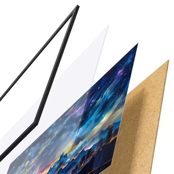 Le poster se compose d'un cadre, d'un plexiglas, d'une image imprimée et d'un support en aggloméré. Le poster peut être immédiatement accroché au mur grâce aux fixations au dos.