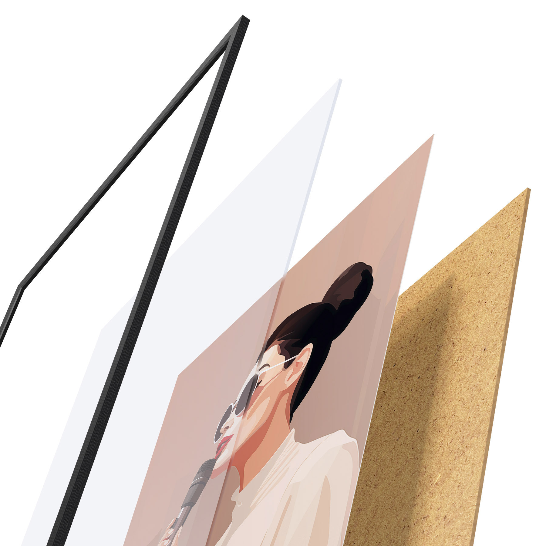 Le poster se compose d'un cadre, d'un plexiglas, d'une image imprimée et d'un support en aggloméré. Le poster peut être immédiatement accroché au mur grâce aux fixations au dos.