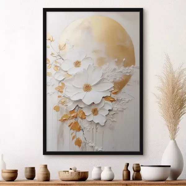 Affiche Fleurs blanches rehaussées de touches jaunes et feuilles délicates sur fond texturé, art moderne Non f47414