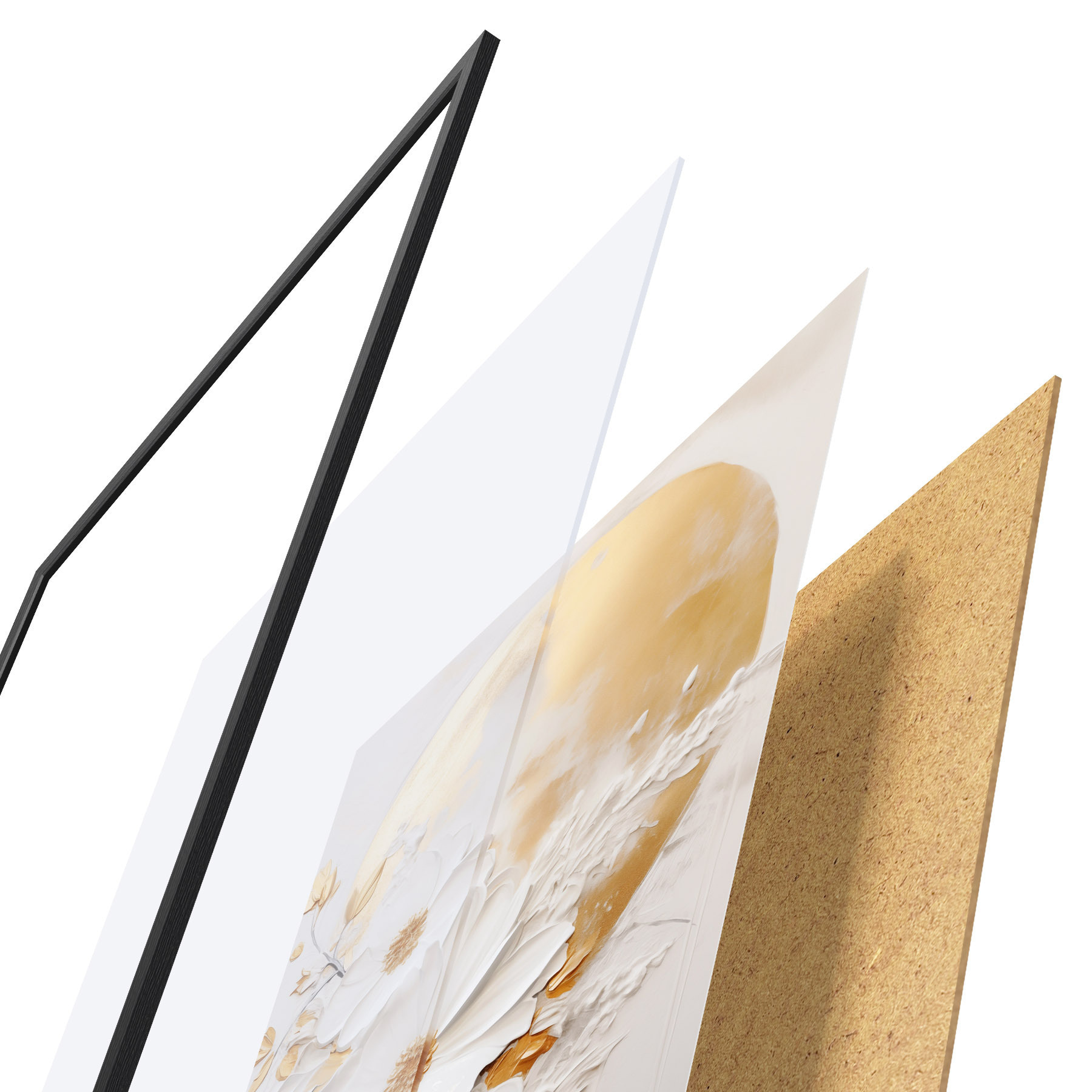 Le poster se compose d'un cadre, d'un plexiglas, d'une image imprimée et d'un support en aggloméré. Le poster peut être immédiatement accroché au mur grâce aux fixations au dos.