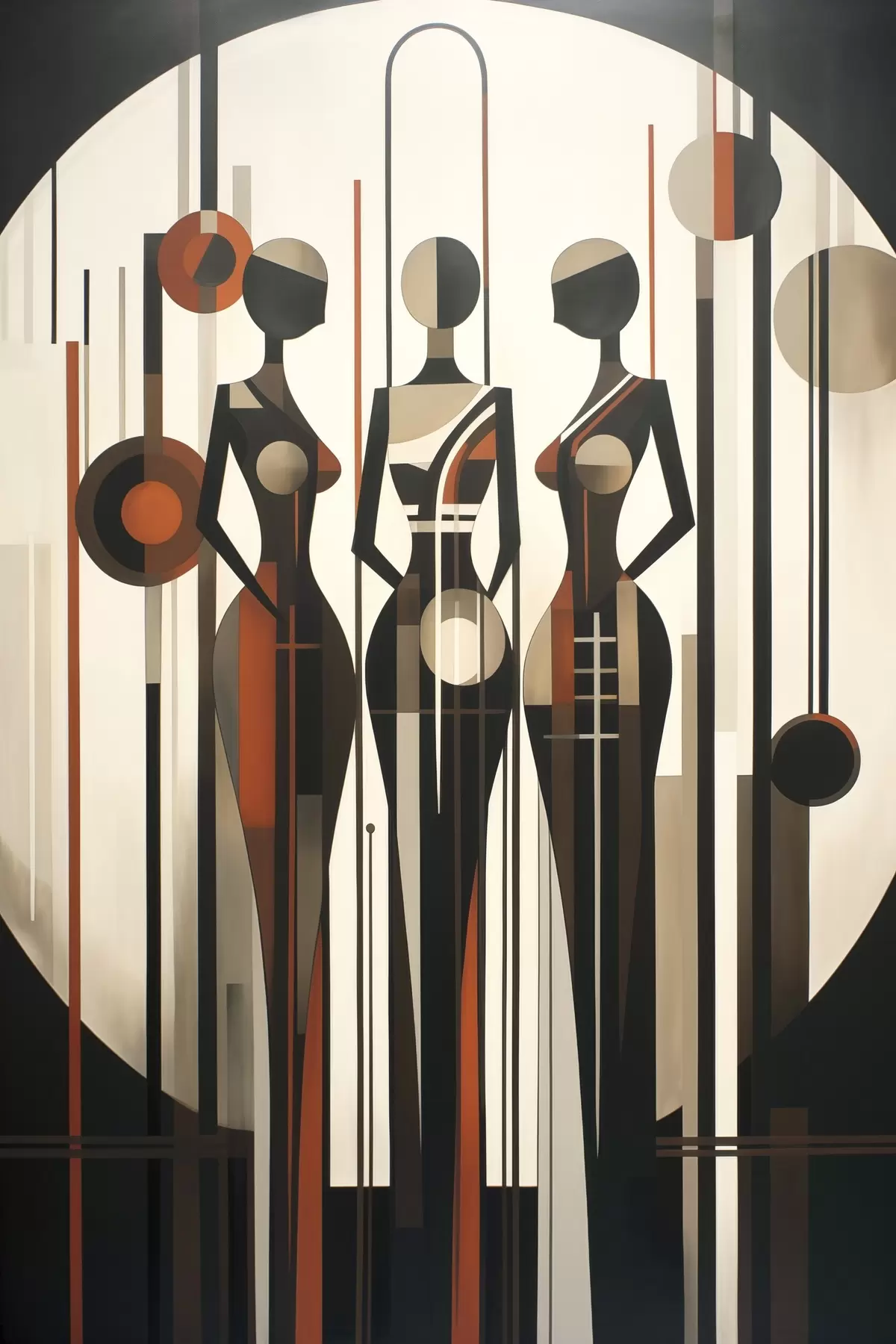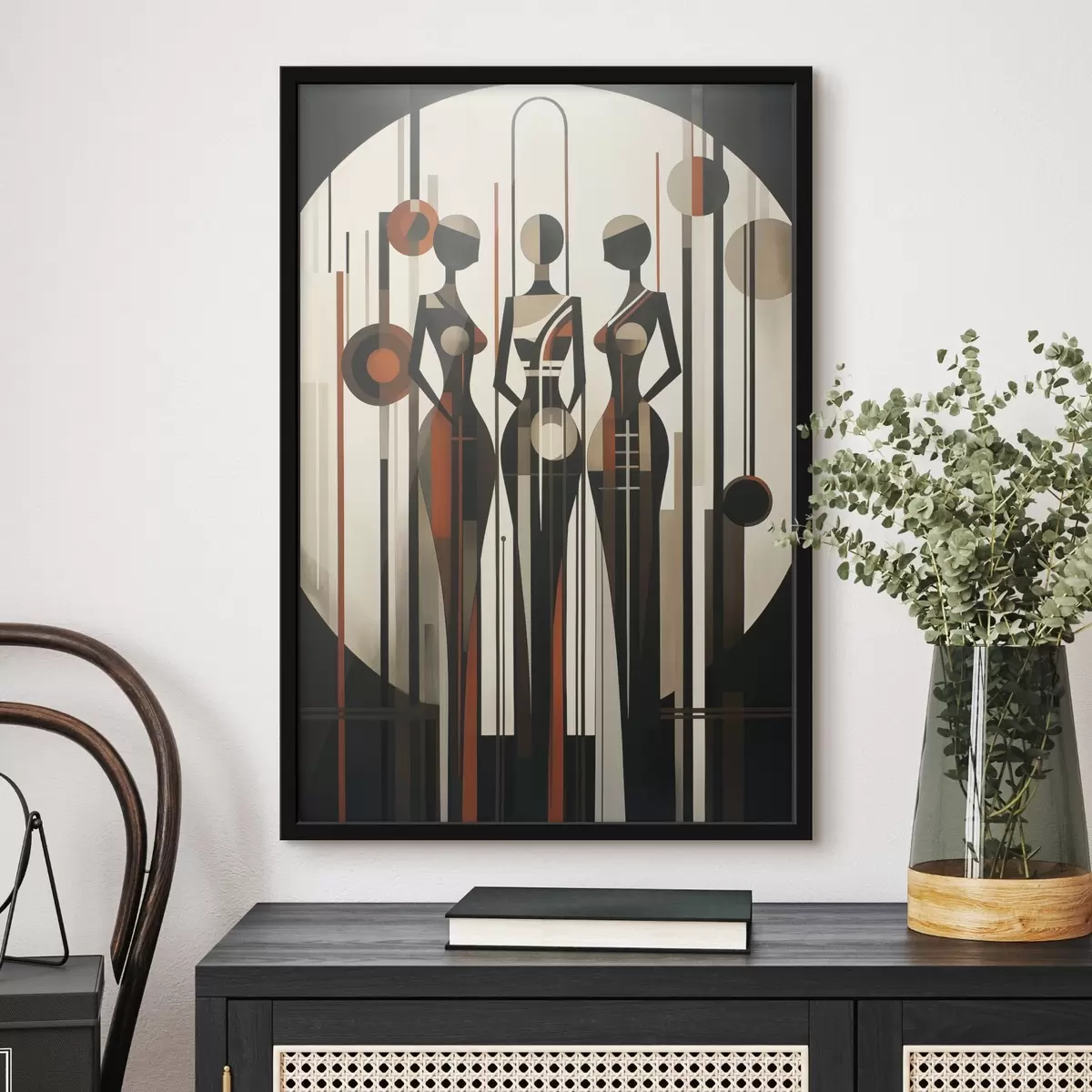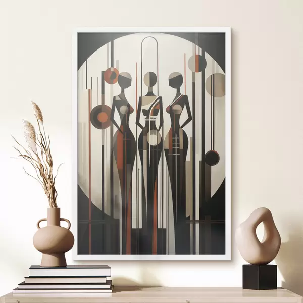 Affiche Figures féminines stylisées avec des éléments géométriques sur un fond abstrait composé de lignes verticales et de cercles. f47422