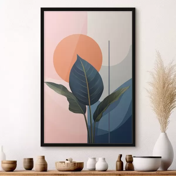 Affiche Feuilles sombres sur fond de formes abstraites dans les tons pêche et gris avec un cercle orange Non f47425