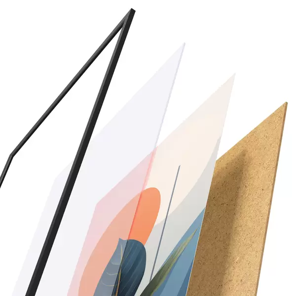 Le poster se compose d'un cadre, d'un plexiglas, d'une image imprimée et d'un support en aggloméré. Le poster peut être immédiatement accroché au mur grâce aux fixations au dos.