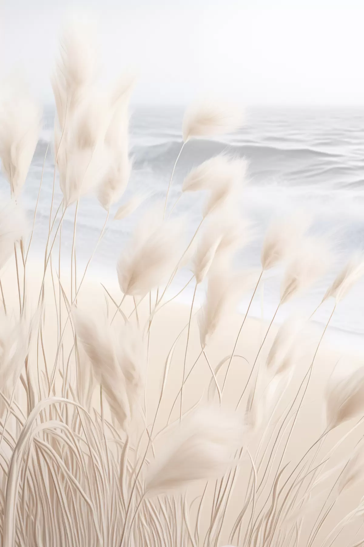 Affiche Haute herbe de pampa plumeuse dans des tons beiges doux au premier plan, avec une plage de sable en arrière-plan. Non f47432