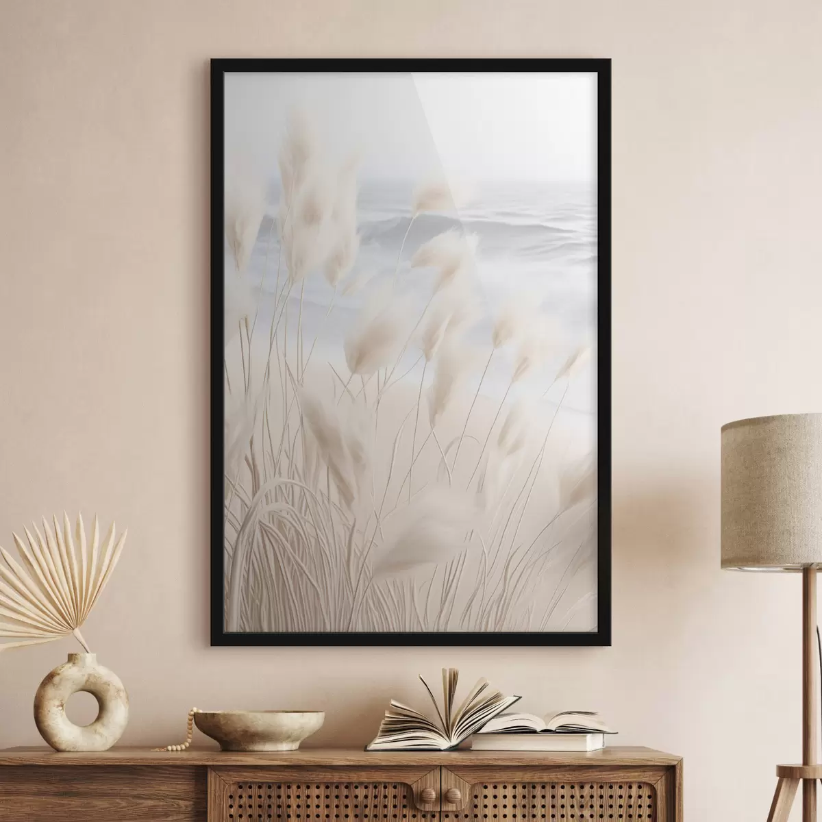 Affiche Haute herbe de pampa plumeuse dans des tons beiges doux au premier plan, avec une plage de sable en arrière-plan. f47432