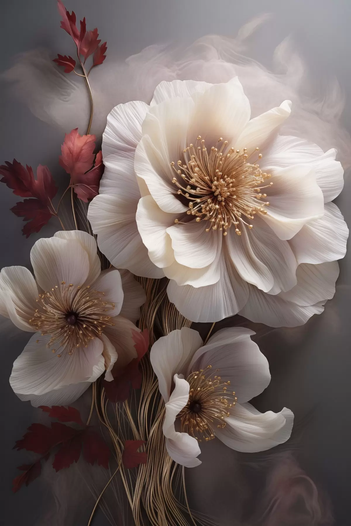 Affiche Pivoines délicates aux pétales fins et vaporeux, entourées de feuilles rouge foncé sur fond abstrait. Non f47434