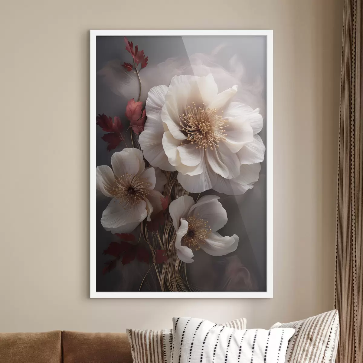 Affiche Pivoines délicates aux pétales fins et vaporeux, entourées de feuilles rouge foncé sur fond abstrait. f47434