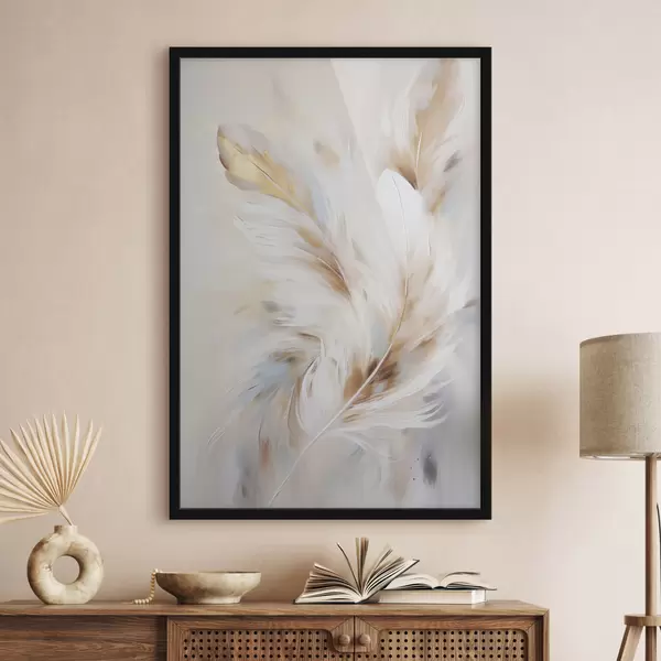 Affiche Grandes plumes douces aux teintes blanches, jaunes et brunes, sur un fond clair et abstrait. f47442