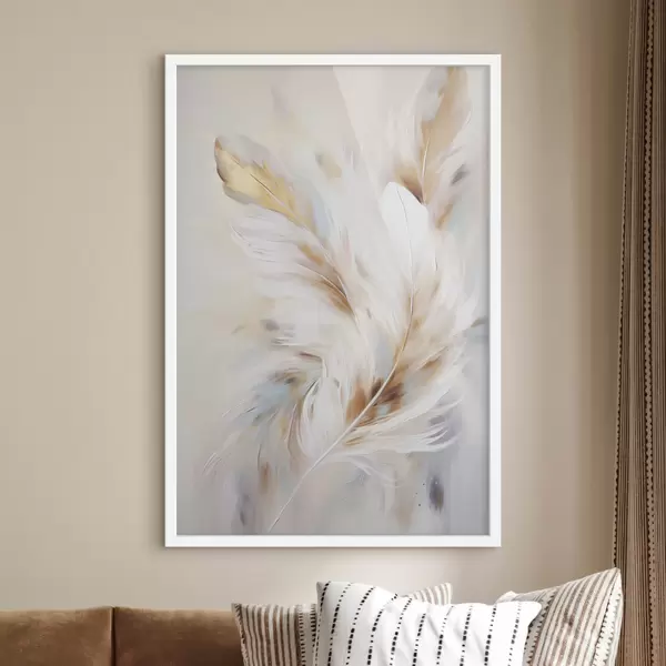 Affiche Grandes plumes douces aux teintes blanches, jaunes et brunes, sur un fond clair et abstrait. Non f47442