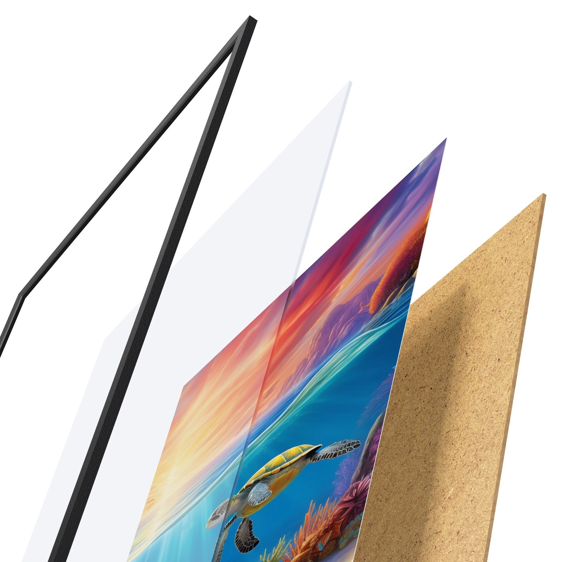 Le poster se compose d'un cadre, d'un plexiglas, d'une image imprimée et d'un support en aggloméré. Le poster peut être immédiatement accroché au mur grâce aux fixations au dos.