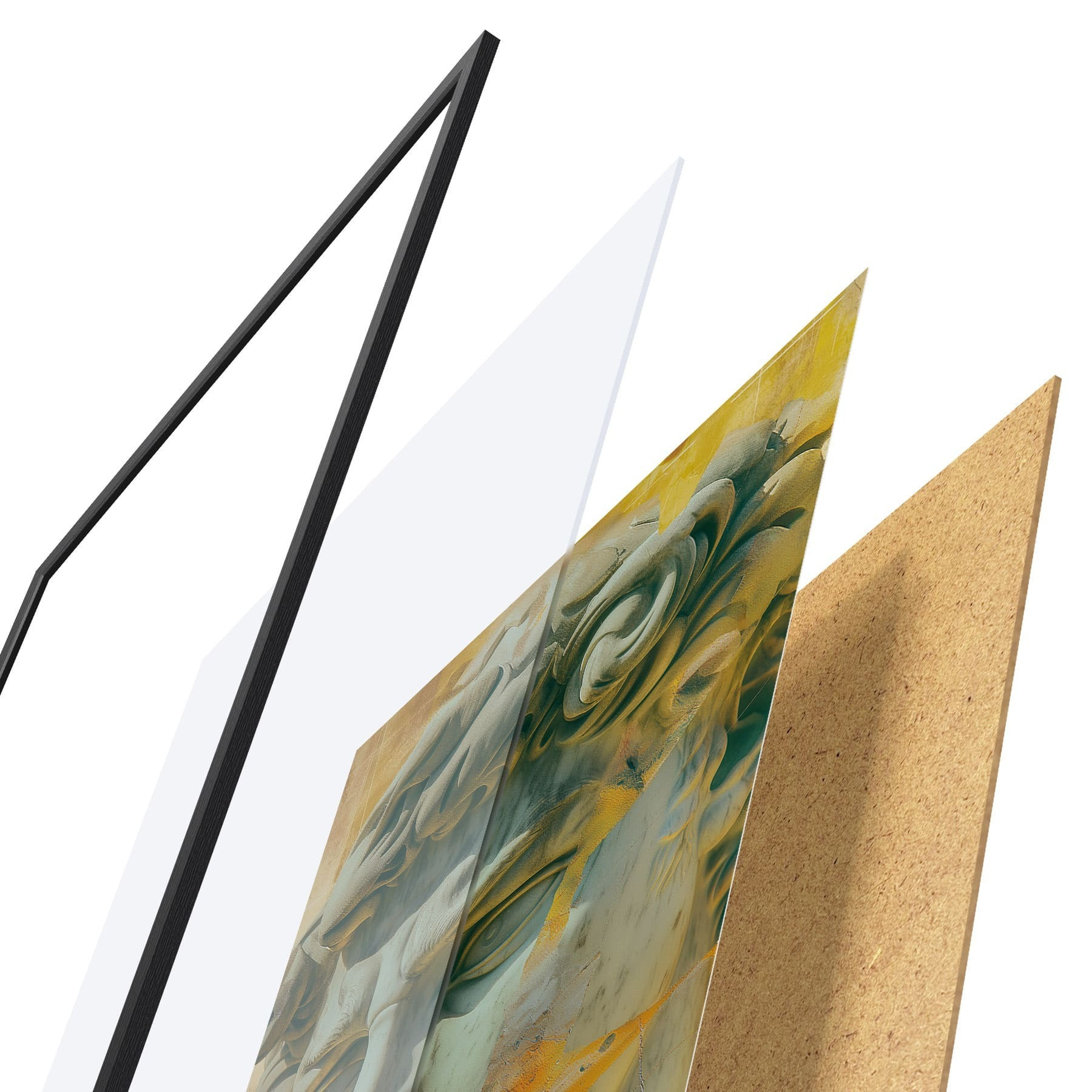 Le poster se compose d'un cadre, d'un plexiglas, d'une image imprimée et d'un support en aggloméré. Le poster peut être immédiatement accroché au mur grâce aux fixations au dos.
