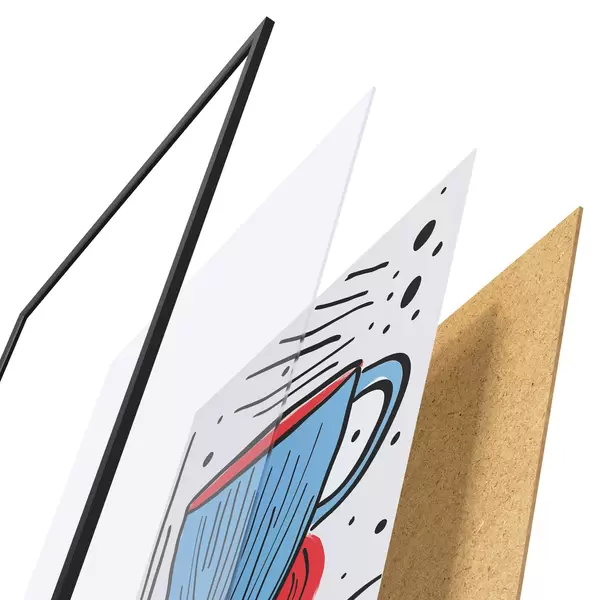 Le poster se compose d'un cadre, d'un plexiglas, d'une image imprimée et d'un support en aggloméré. Le poster peut être immédiatement accroché au mur grâce aux fixations au dos.