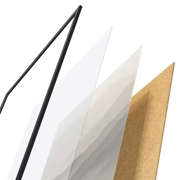 Le poster se compose d'un cadre, d'un plexiglas, d'une image imprimée et d'un support en aggloméré. Le poster peut être immédiatement accroché au mur grâce aux fixations au dos.