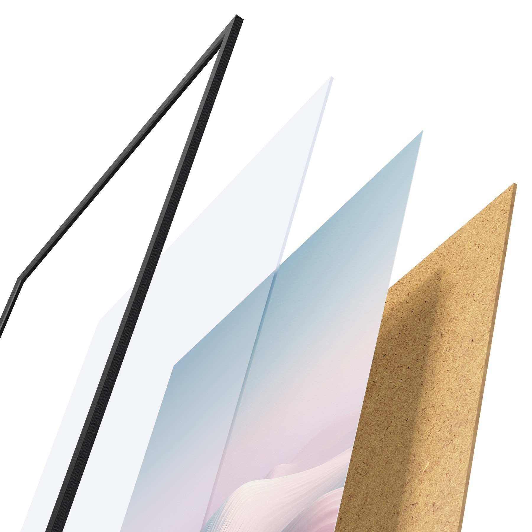 Le poster se compose d'un cadre, d'un plexiglas, d'une image imprimée et d'un support en aggloméré. Le poster peut être immédiatement accroché au mur grâce aux fixations au dos.