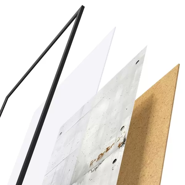 Le poster se compose d'un cadre, d'un plexiglas, d'une image imprimée et d'un support en aggloméré. Le poster peut être immédiatement accroché au mur grâce aux fixations au dos.