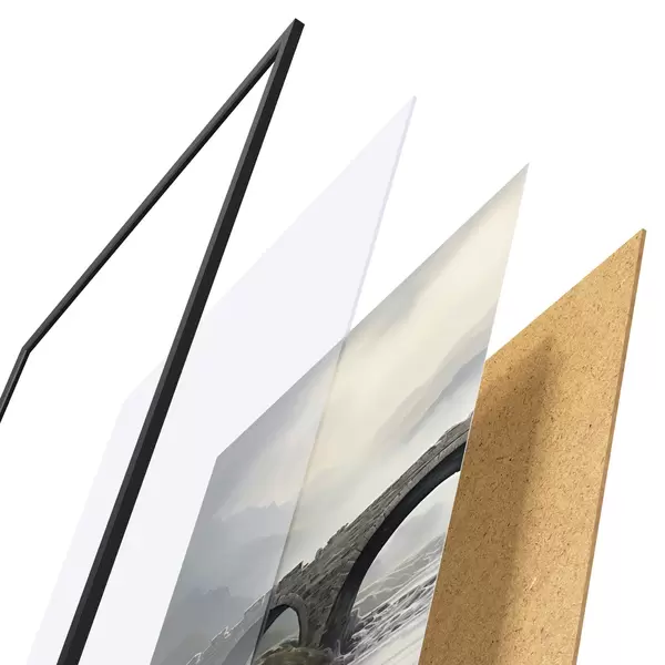 Le poster se compose d'un cadre, d'un plexiglas, d'une image imprimée et d'un support en aggloméré. Le poster peut être immédiatement accroché au mur grâce aux fixations au dos.
