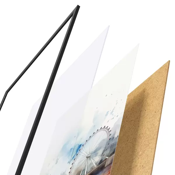 Le poster se compose d'un cadre, d'un plexiglas, d'une image imprimée et d'un support en aggloméré. Le poster peut être immédiatement accroché au mur grâce aux fixations au dos.