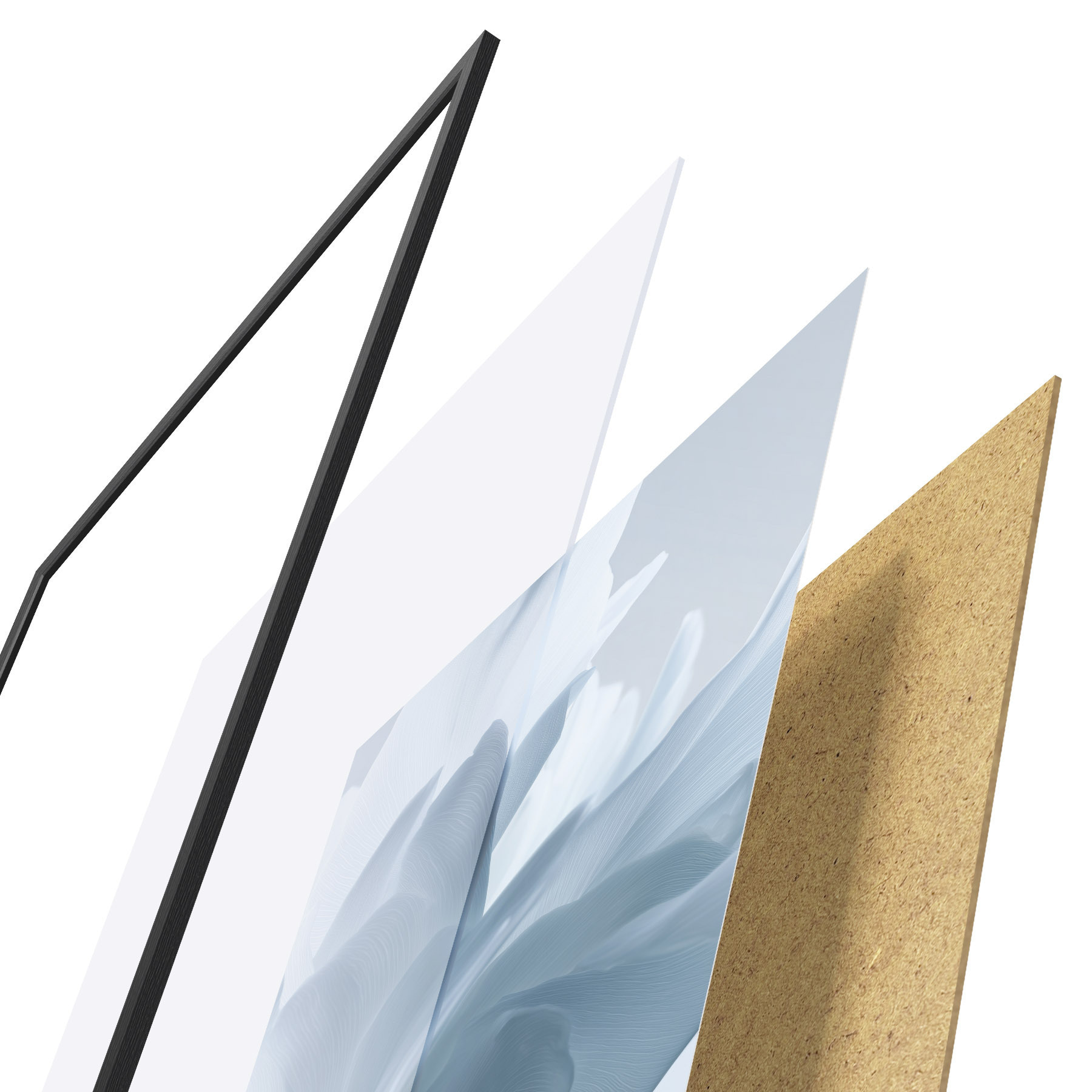 Le poster se compose d'un cadre, d'un plexiglas, d'une image imprimée et d'un support en aggloméré. Le poster peut être immédiatement accroché au mur grâce aux fixations au dos.