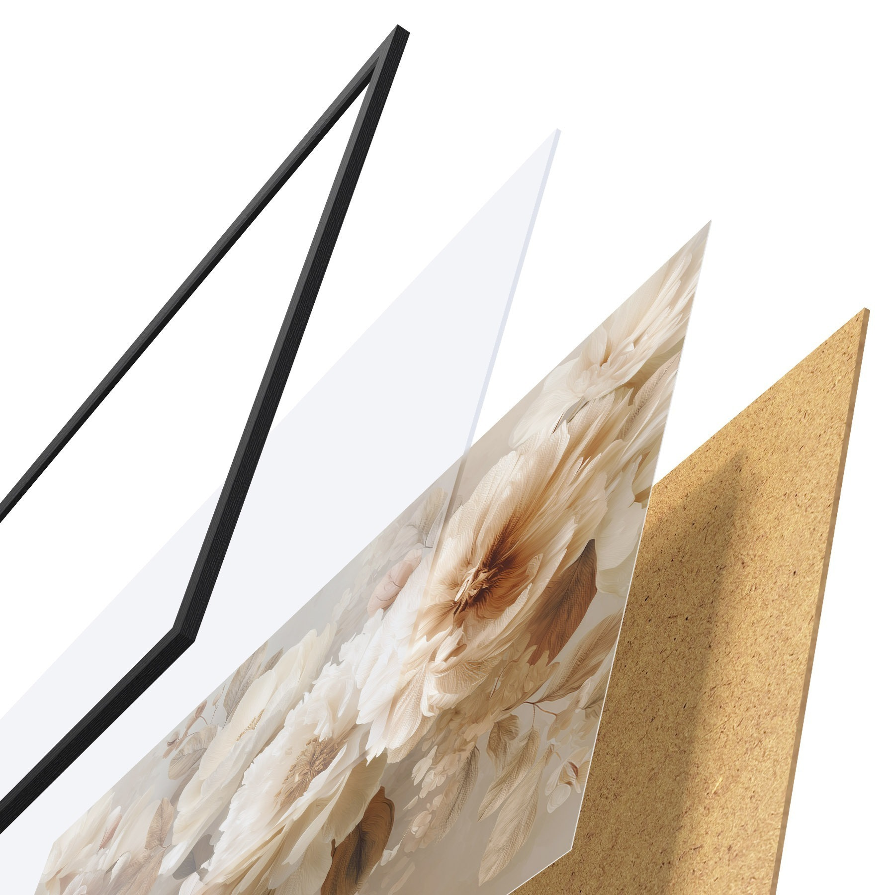Le poster se compose d'un cadre, d'un plexiglas, d'une image imprimée et d'un support en aggloméré. Le poster peut être immédiatement accroché au mur grâce aux fixations au dos.