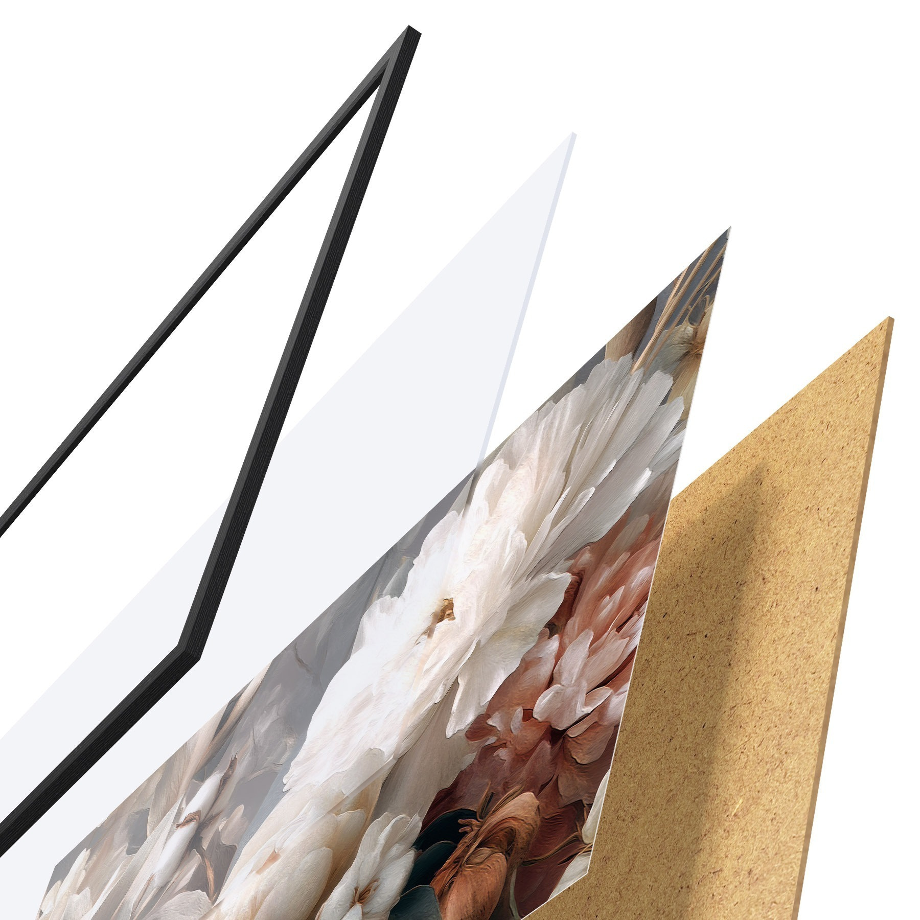 Le poster se compose d'un cadre, d'un plexiglas, d'une image imprimée et d'un support en aggloméré. Le poster peut être immédiatement accroché au mur grâce aux fixations au dos.