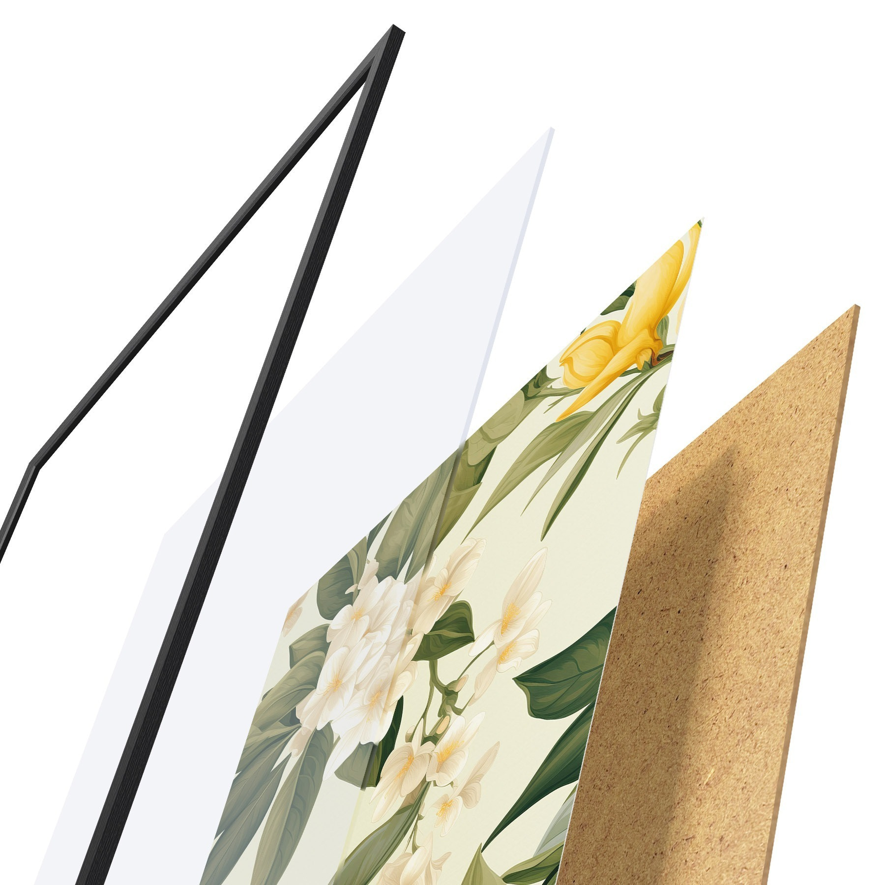 Le poster se compose d'un cadre, d'un plexiglas, d'une image imprimée et d'un support en aggloméré. Le poster peut être immédiatement accroché au mur grâce aux fixations au dos.