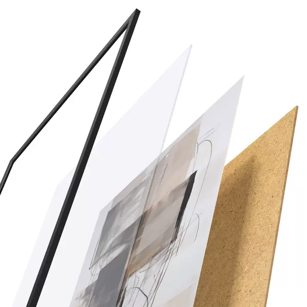 Le poster se compose d'un cadre, d'un plexiglas, d'une image imprimée et d'un support en aggloméré. Le poster peut être immédiatement accroché au mur grâce aux fixations au dos.