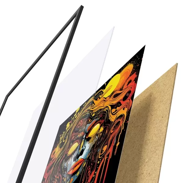 Le poster se compose d'un cadre, d'un plexiglas, d'une image imprimée et d'un support en aggloméré. Le poster peut être immédiatement accroché au mur grâce aux fixations au dos.