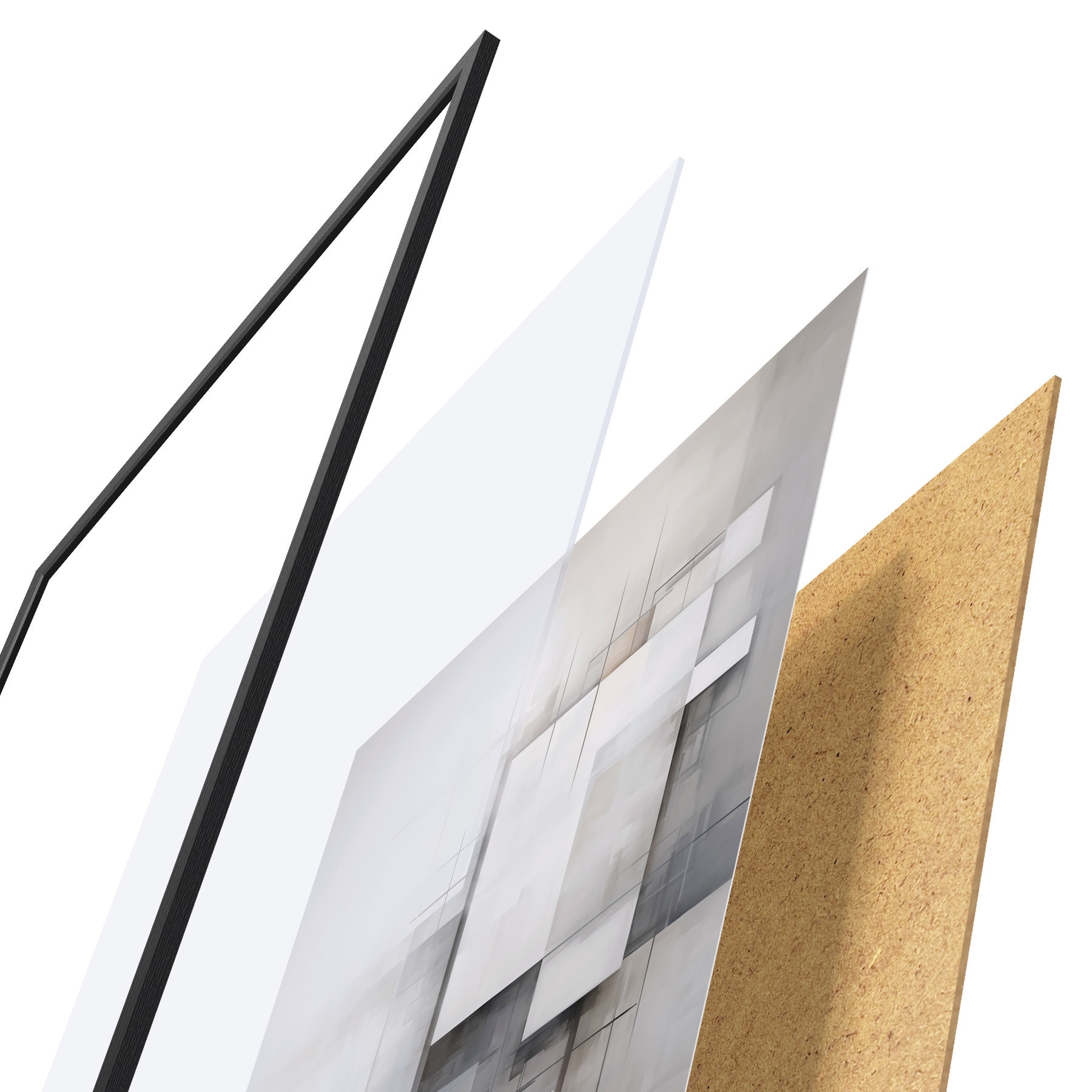 Le poster se compose d'un cadre, d'un plexiglas, d'une image imprimée et d'un support en aggloméré. Le poster peut être immédiatement accroché au mur grâce aux fixations au dos.
