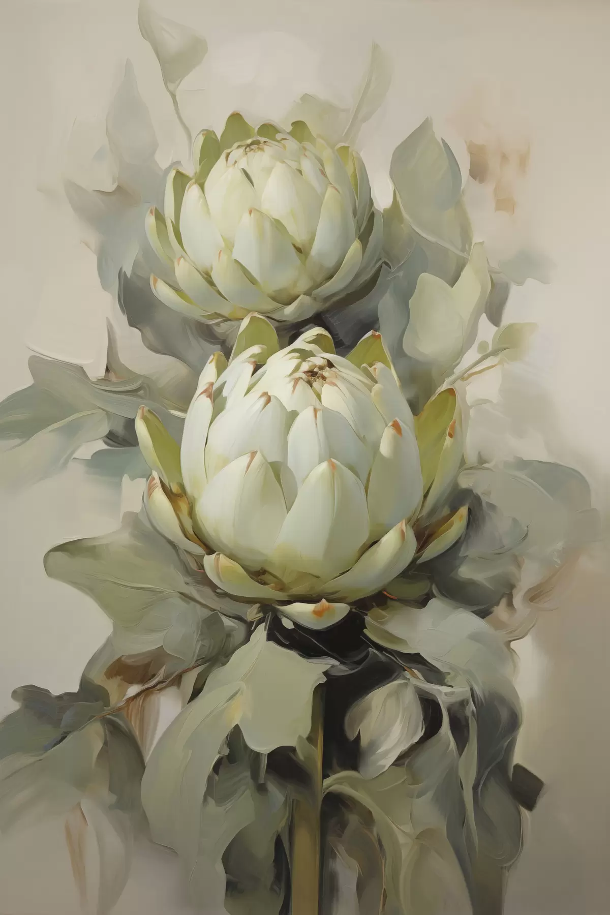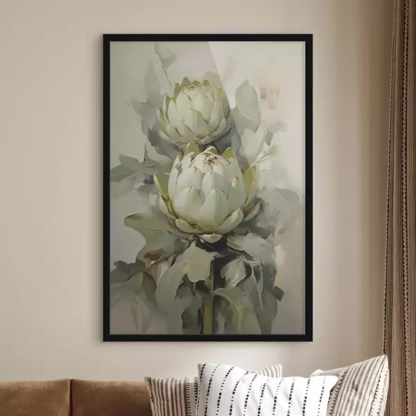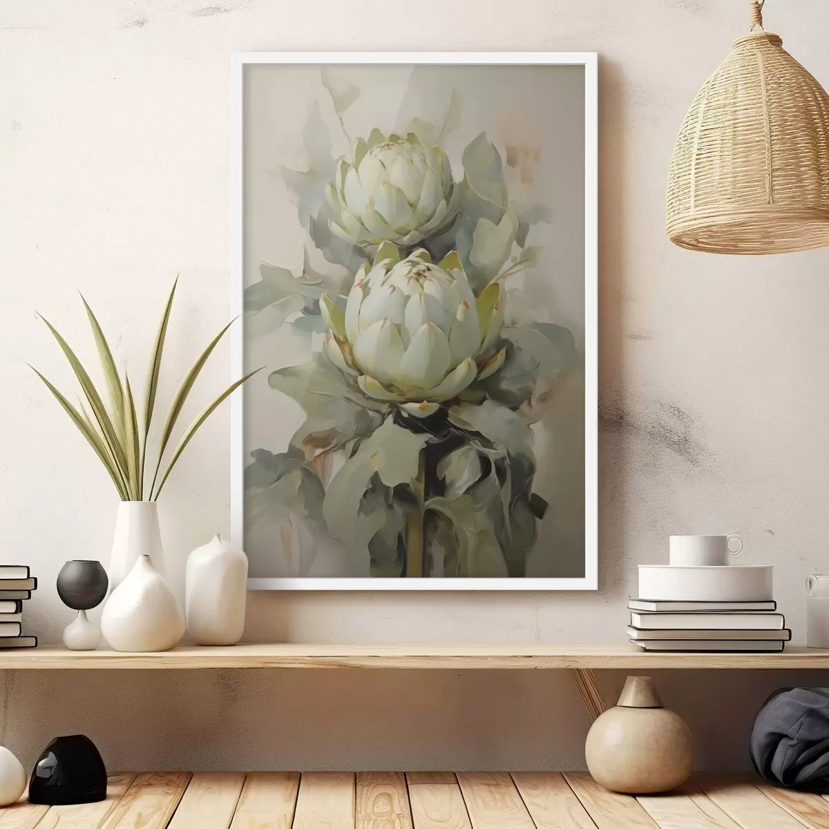 Affiche Style pictural représentant plusieurs fleurs de protéa blanches avec de grandes feuilles vertes sur un fond clair. Non f47862