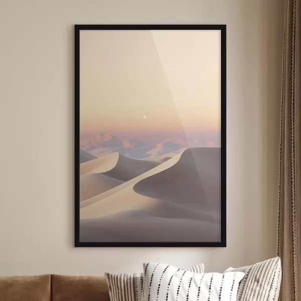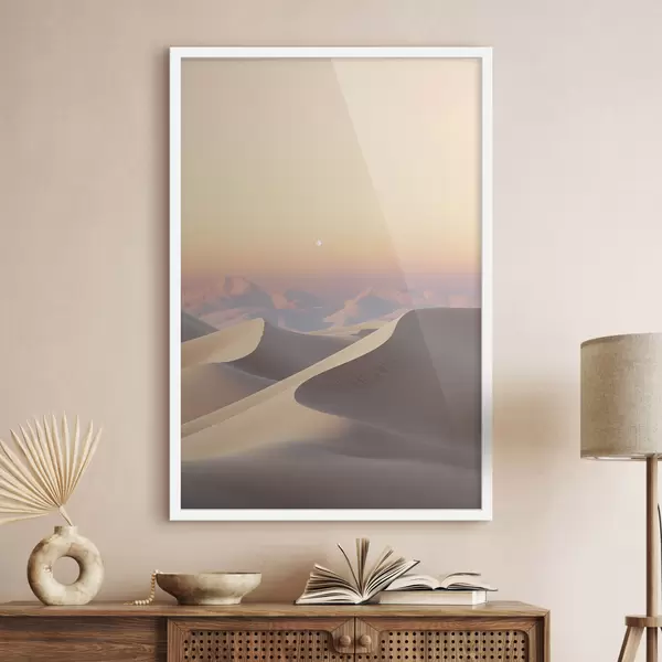 Affiche Un paysage désertique avec des dunes de sable ondulantes sous un ciel pastel doux, des montagnes lointaines en arrière-plan. f47865