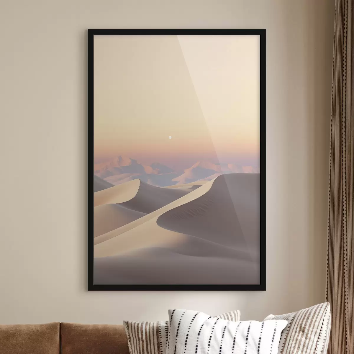 Affiche Un paysage désertique avec des dunes de sable ondulantes sous un ciel pastel doux, des montagnes lointaines en arrière-plan. Non f47865