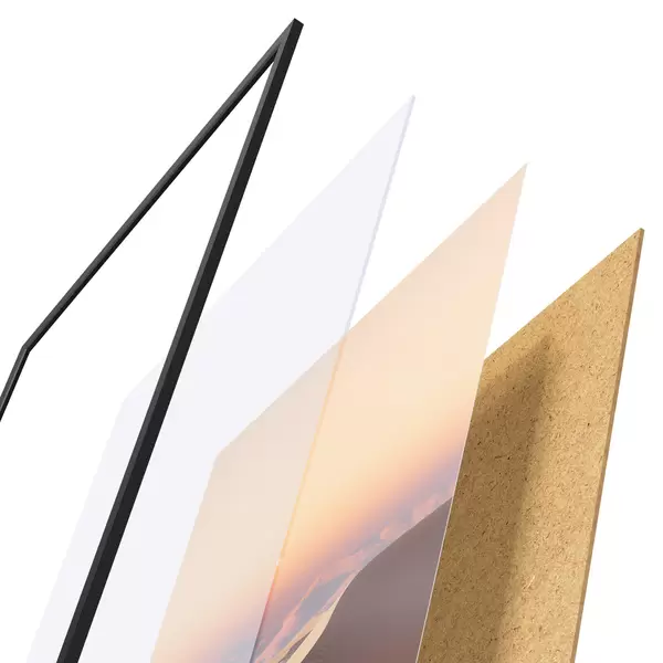 Le poster se compose d'un cadre, d'un plexiglas, d'une image imprimée et d'un support en aggloméré. Le poster peut être immédiatement accroché au mur grâce aux fixations au dos.