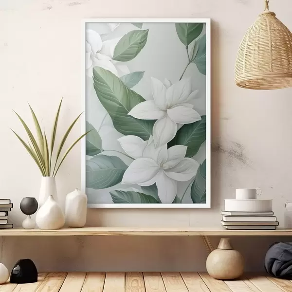 Affiche Fleurs blanches avec feuilles vertes, fond pastel f47869
