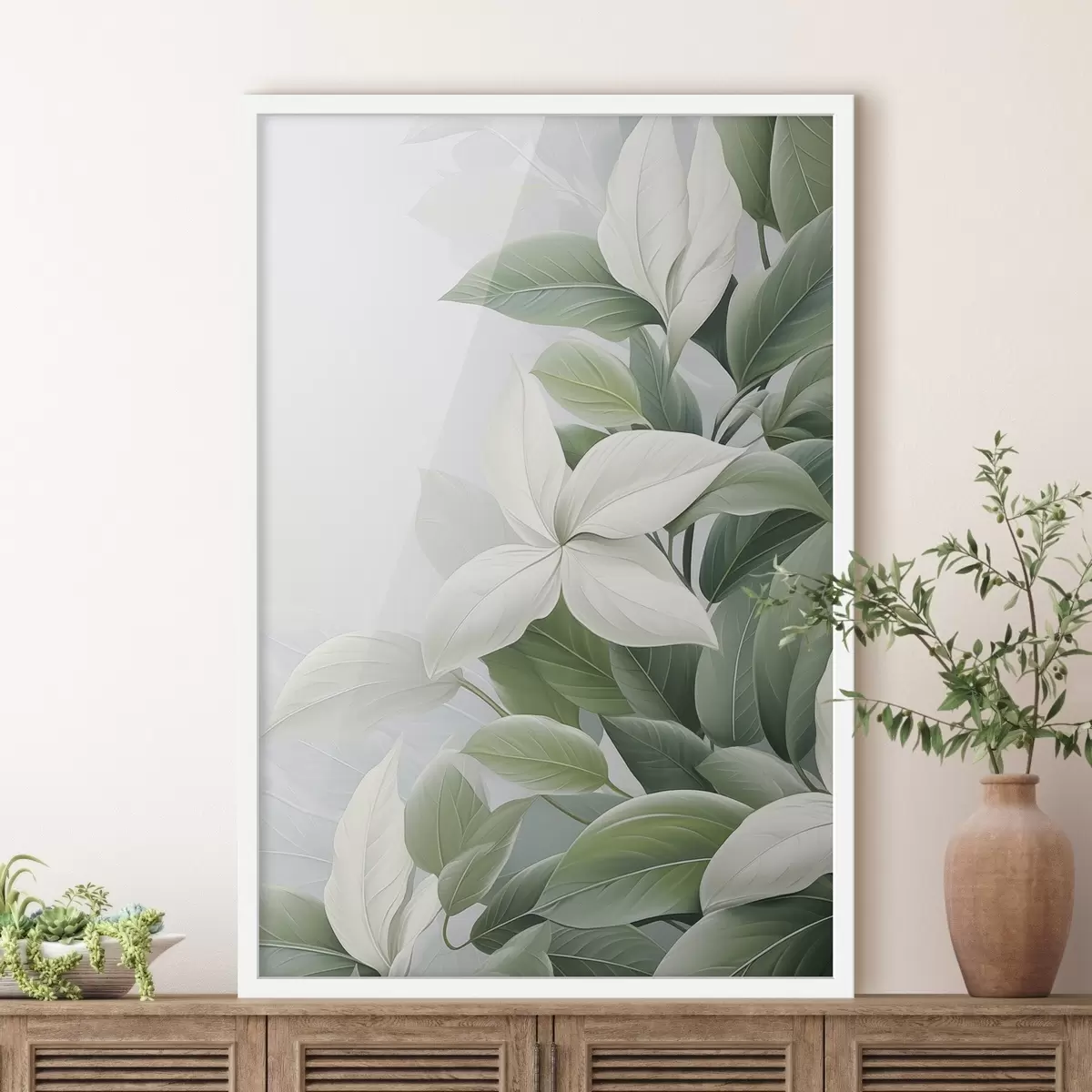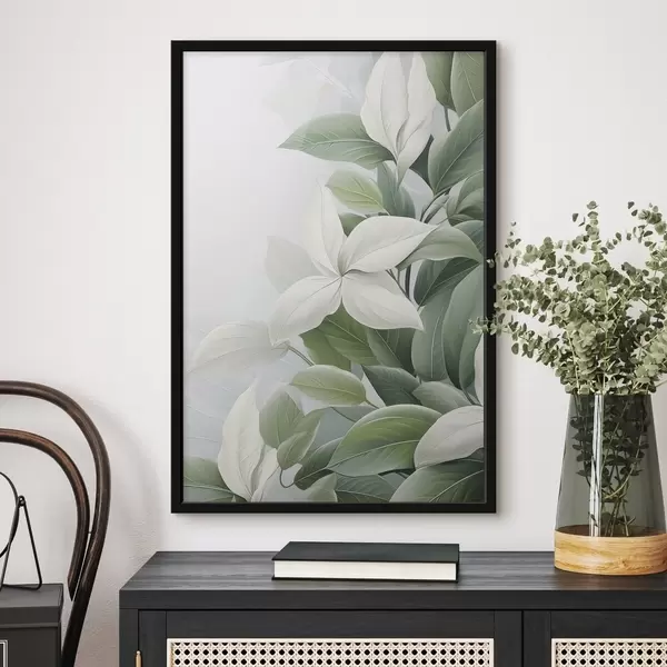 Affiche Fleurs blanches avec feuilles vertes, fond pastel f47870