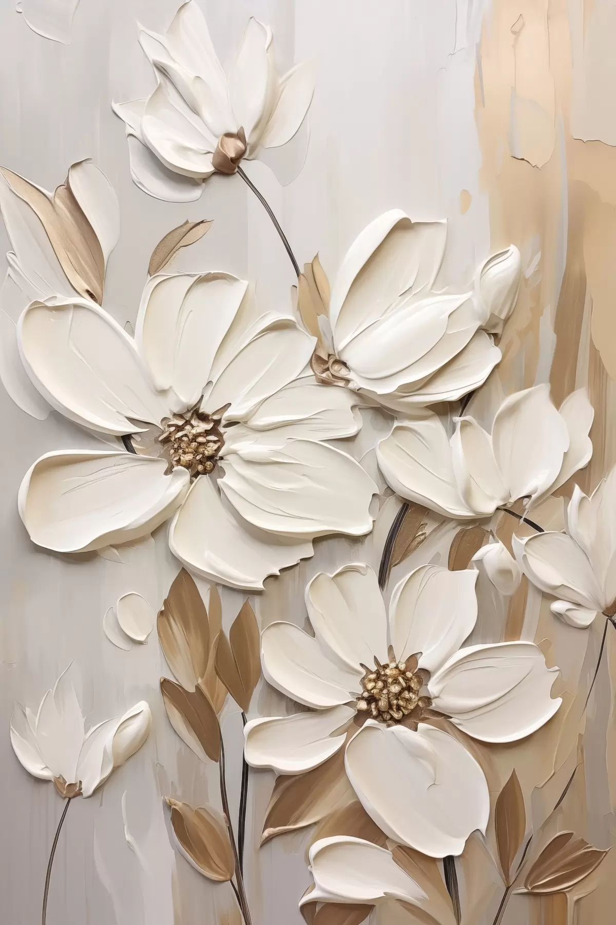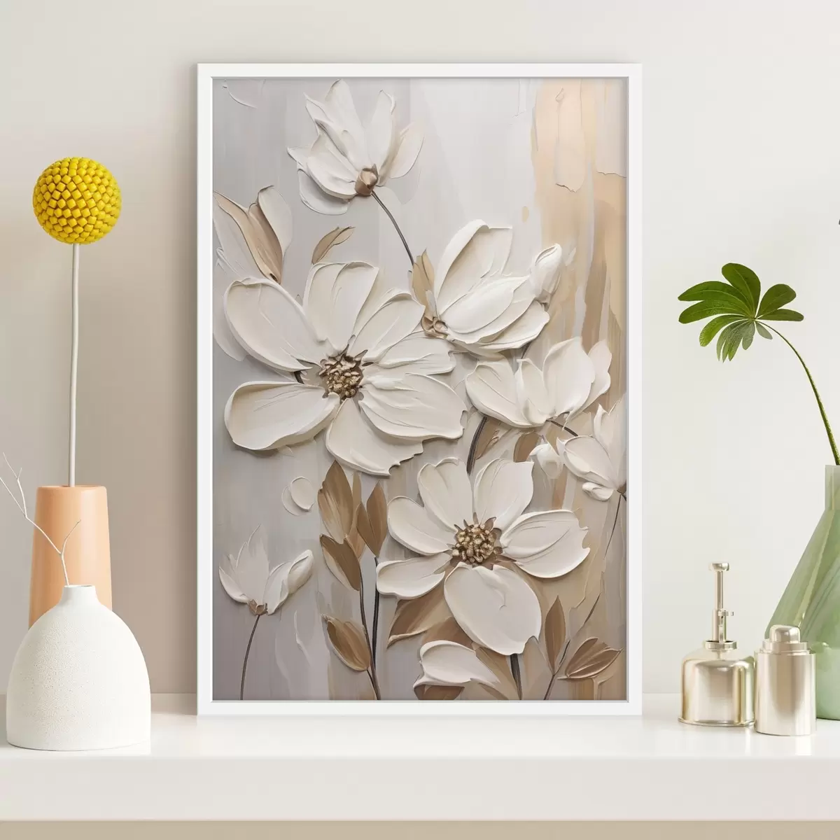Affiche Fleurs blanches abstraites aux pétales texturés, sur fond neutre avec imitation de coups de pinceau subtils. Non f47873