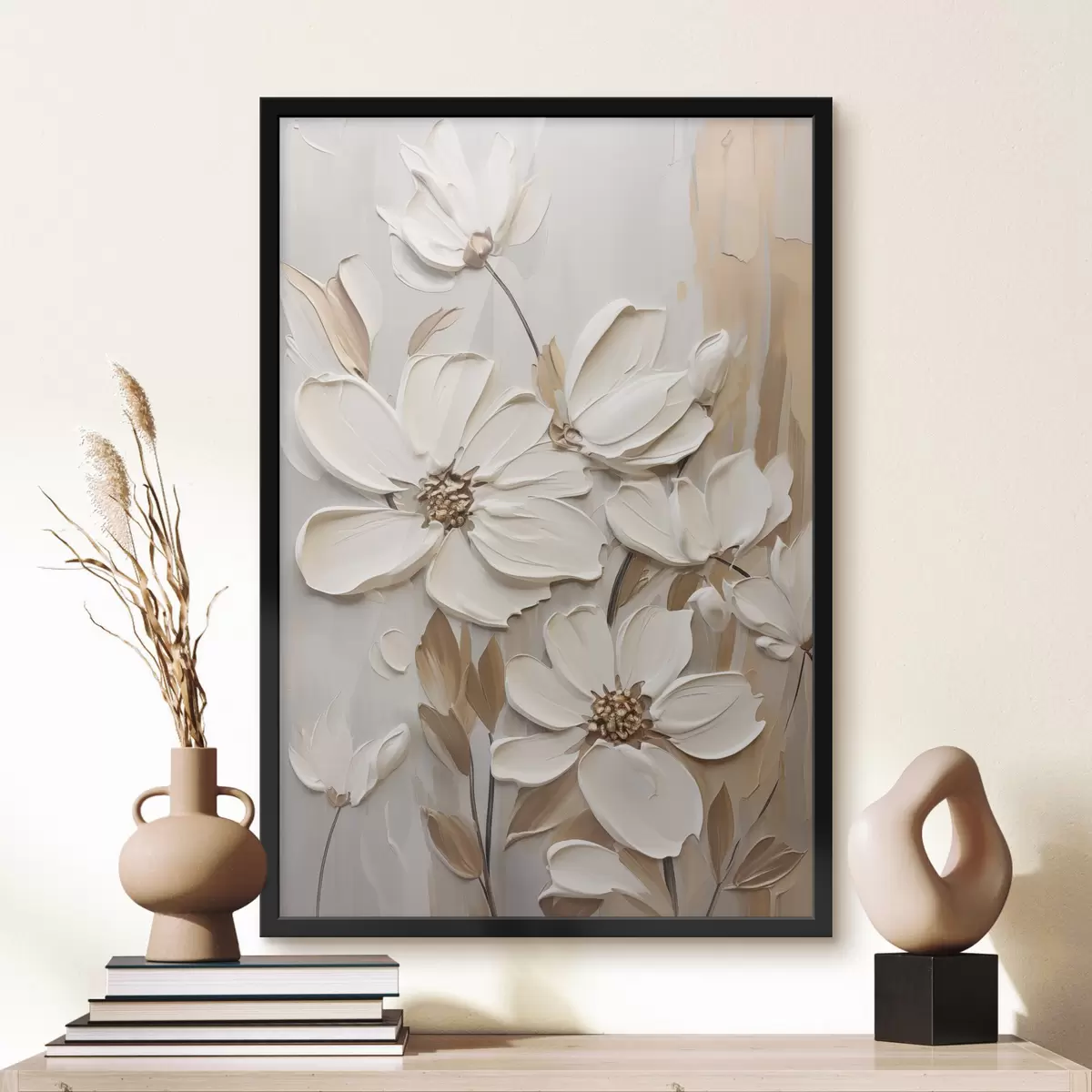 Affiche Fleurs blanches abstraites aux pétales texturés, sur fond neutre avec imitation de coups de pinceau subtils. f47873