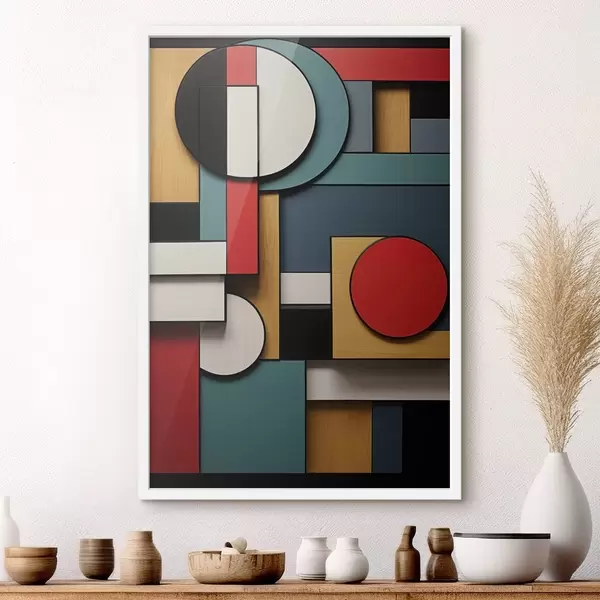 Affiche Composition géométrique abstraite avec imitation de texture bois, rectangles et cercles rouges, noirs, blancs et bleu sarcelle f47875