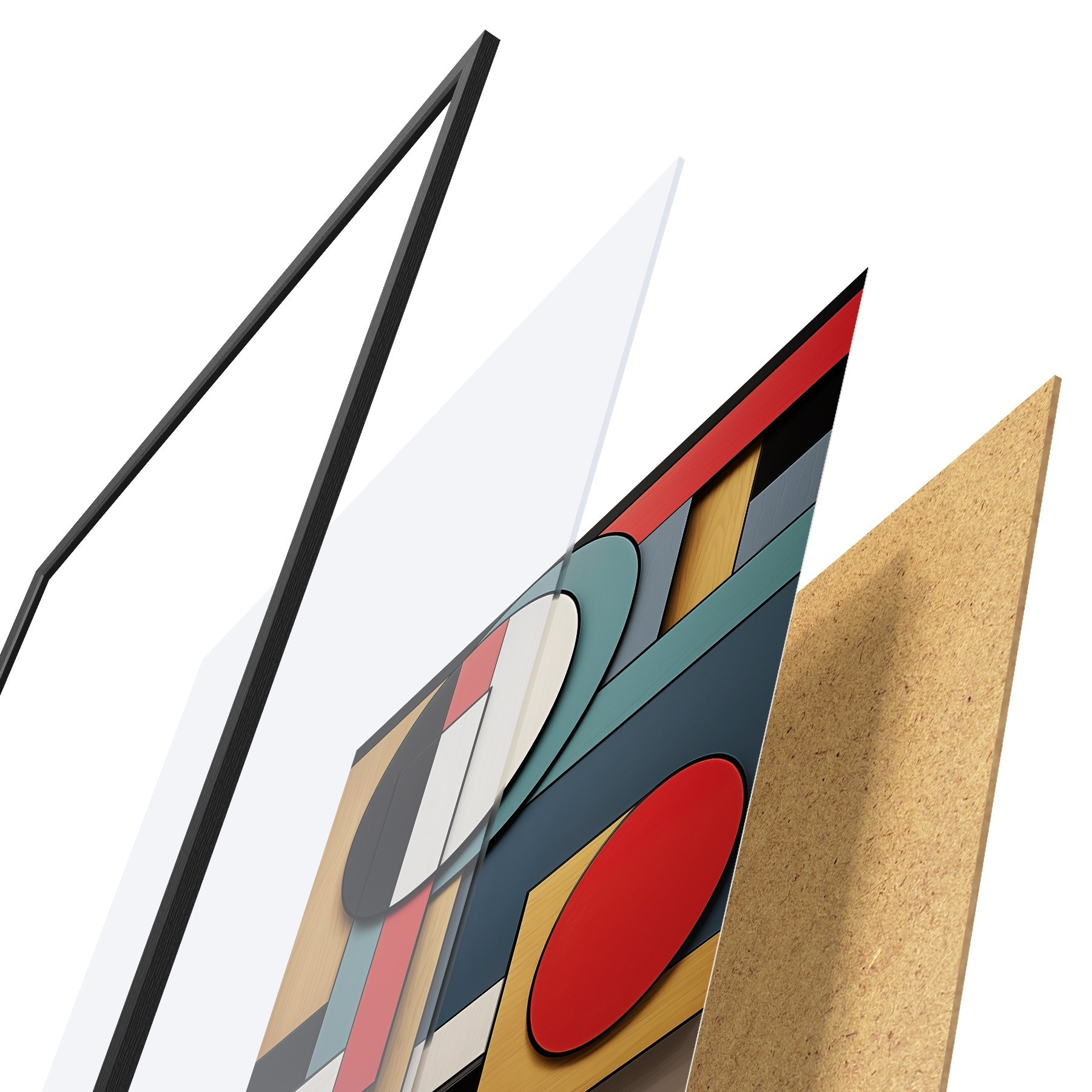 Affiche Composition géométrique abstraite avec imitation de texture bois, rectangles et cercles rouges, noirs, blancs et bleu sarcelle Non f47875