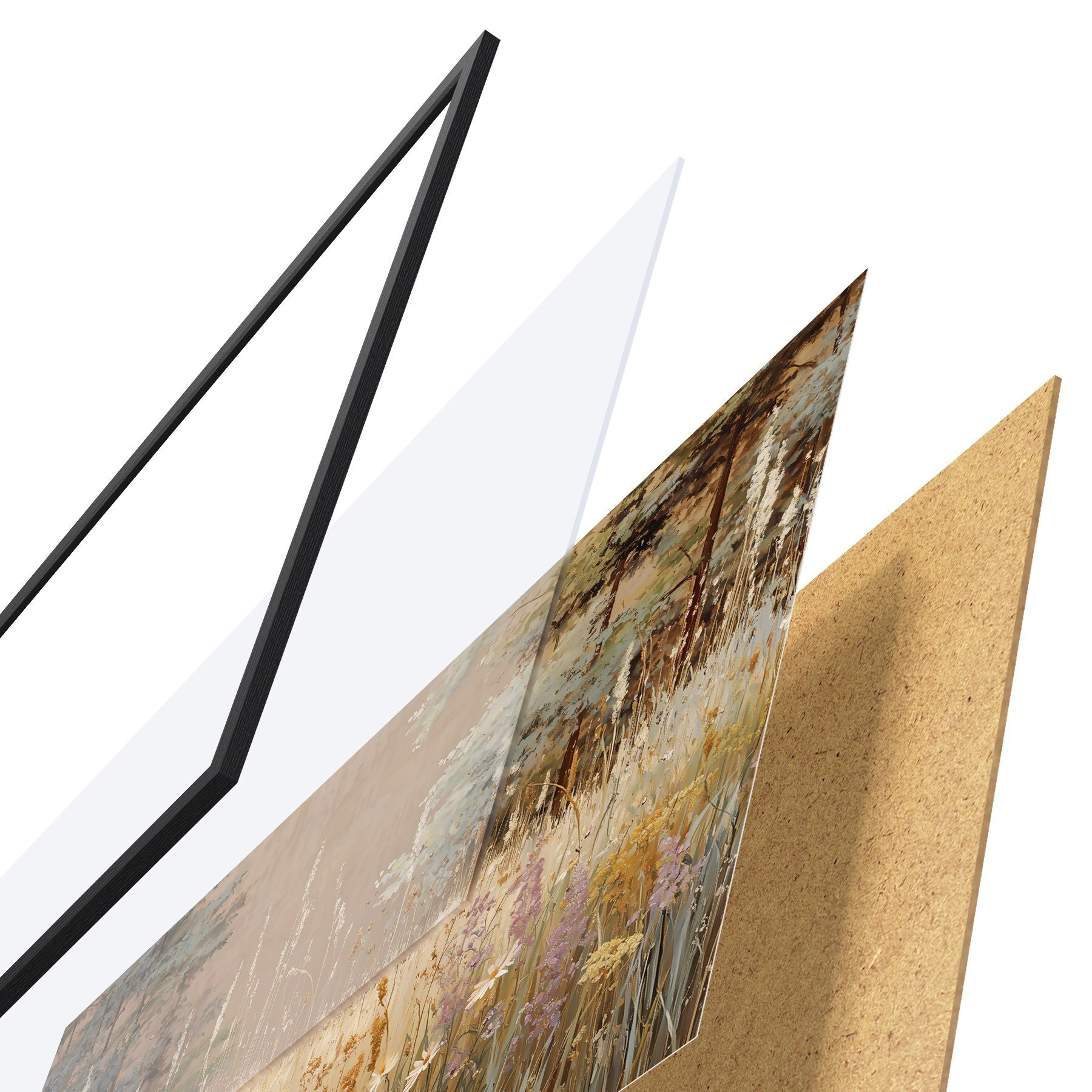 Le poster se compose d'un cadre, d'un plexiglas, d'une image imprimée et d'un support en aggloméré. Le poster peut être immédiatement accroché au mur grâce aux fixations au dos.