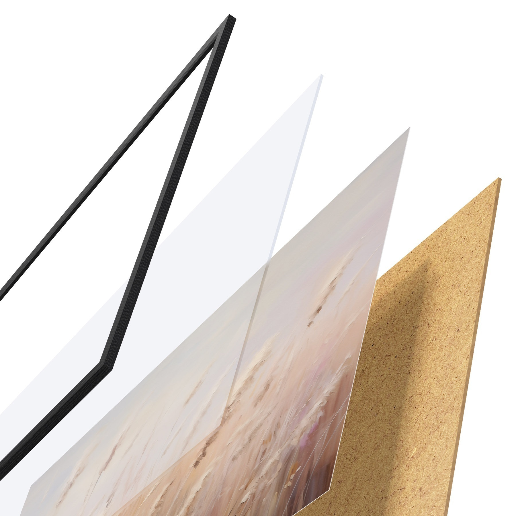 Le poster se compose d'un cadre, d'un plexiglas, d'une image imprimée et d'un support en aggloméré. Le poster peut être immédiatement accroché au mur grâce aux fixations au dos.