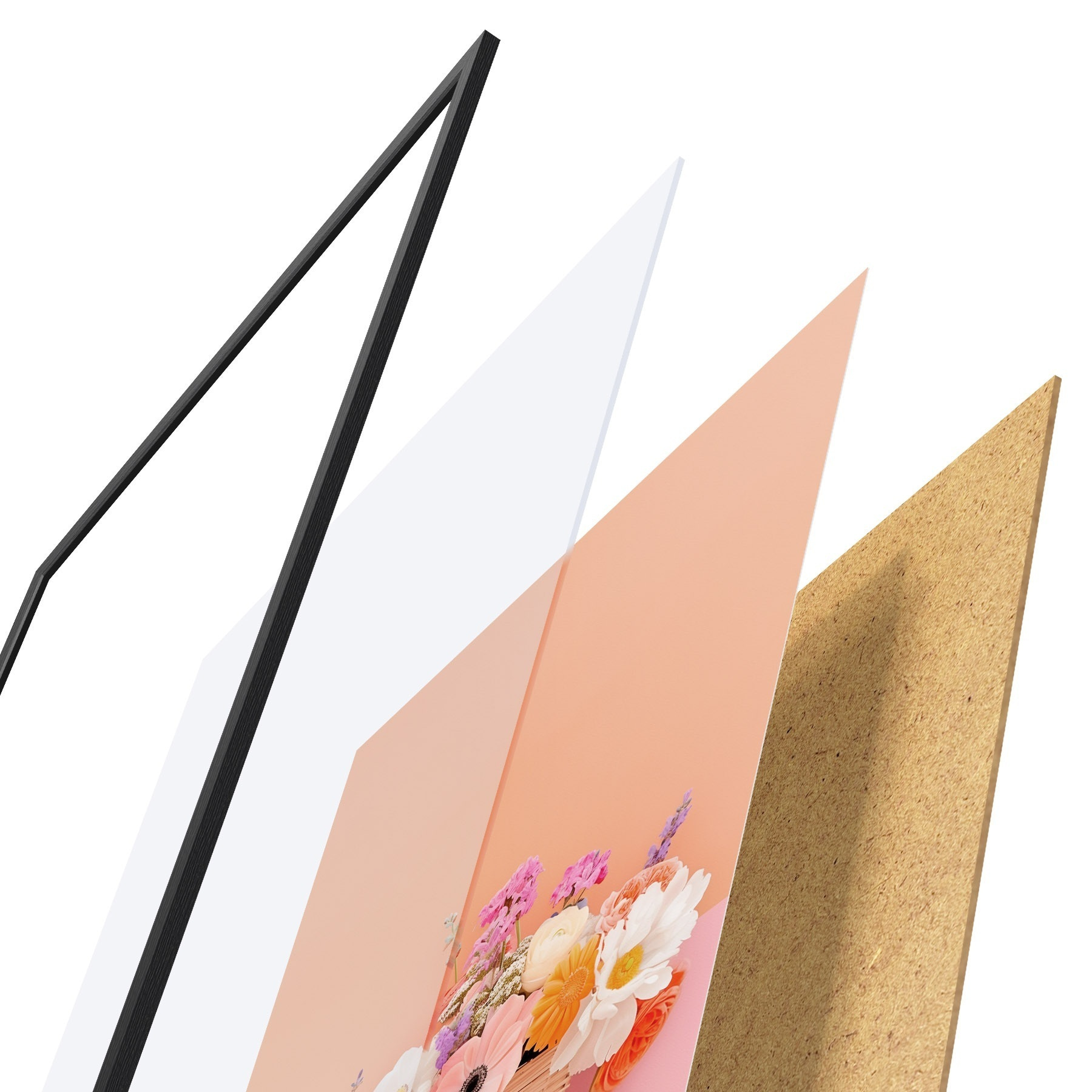 Le poster se compose d'un cadre, d'un plexiglas, d'une image imprimée et d'un support en aggloméré. Le poster peut être immédiatement accroché au mur grâce aux fixations au dos.