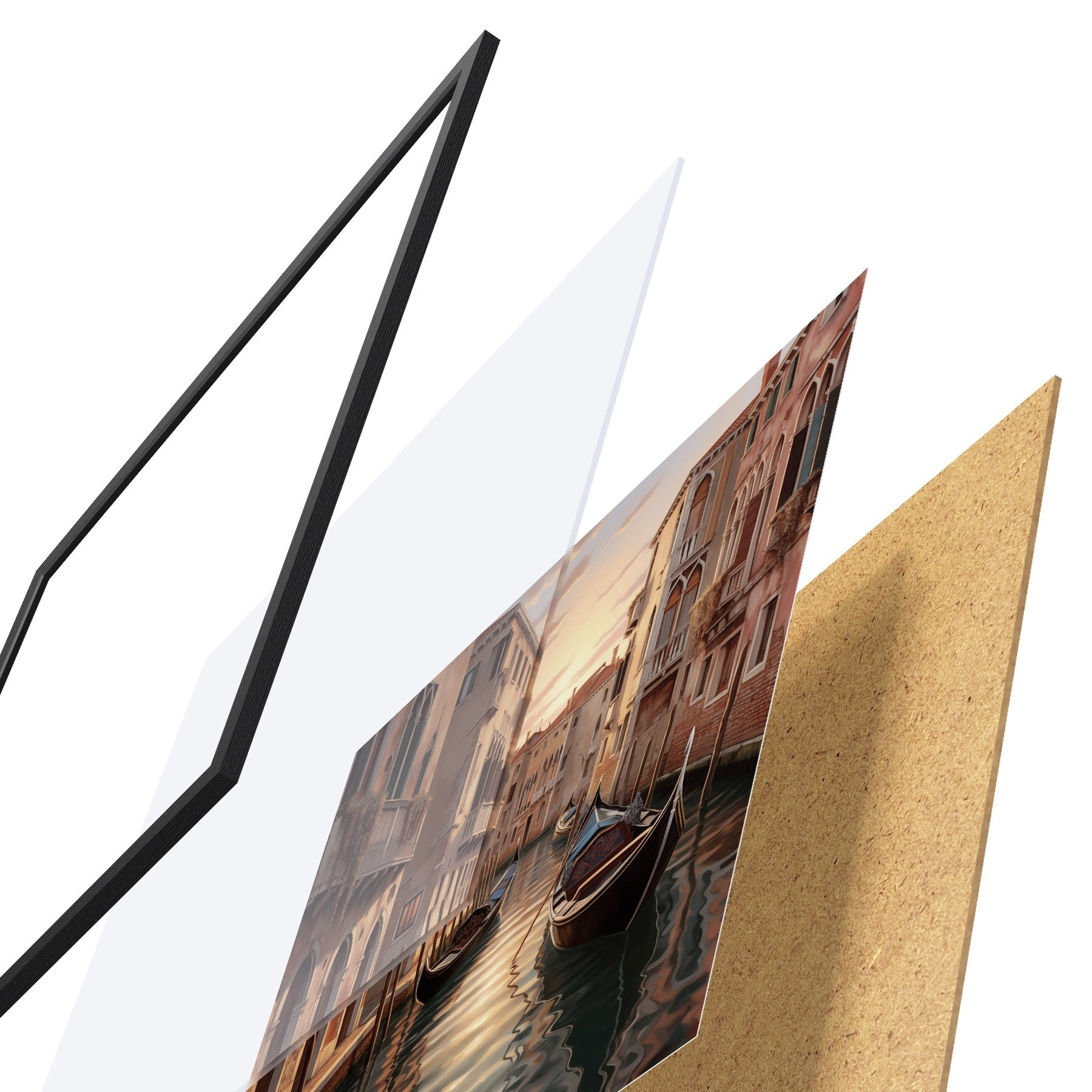 Le poster se compose d'un cadre, d'un plexiglas, d'une image imprimée et d'un support en aggloméré. Le poster peut être immédiatement accroché au mur grâce aux fixations au dos.