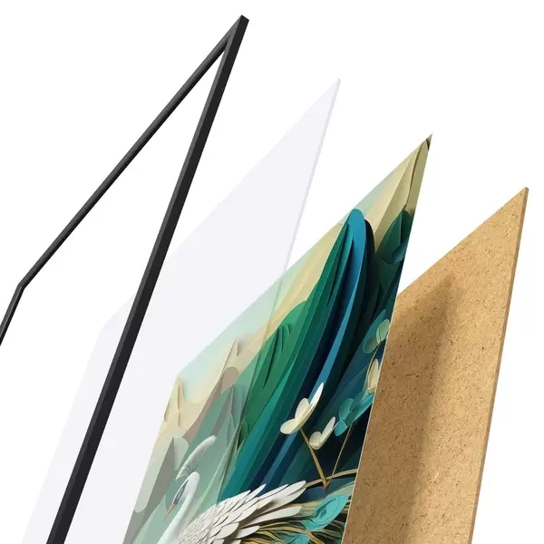 Le poster se compose d'un cadre, d'un plexiglas, d'une image imprimée et d'un support en aggloméré. Le poster peut être immédiatement accroché au mur grâce aux fixations au dos.